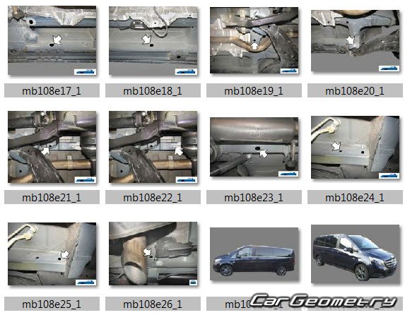 Кузовные размеры для восстановления геометрии кузова автомобилей Mercedes Vito (W447) 2015-2023. С помощью этих данных осуществляется проверка геометрии кузова (база SWB 3200 и LWB 3430), с последующей рихтовкой поврежденных частей автомобилей Мерседес Вито. Данные могут быть использованы для кузовного ремонта Mercedes-Benz Metris W447 (американский рынок).