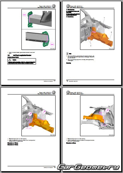 Заводское руководство содержит контрольные размеры кузова Volkswagen Passat B7 (NMS) 2012-2022 Sedan USA Body Repair Manual и включает описание замены различных элементов кузова седан (WB 2804mm), контрольные точки геометрии кузова Фольксваген Пассат для американского рынка.