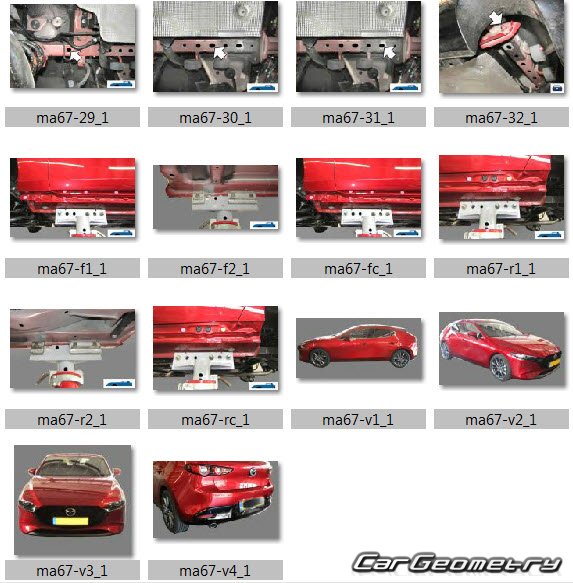 Кузовные размеры для восстановления геометрии кузова автомобилей Mazda 3 Hatchback (BP) 2019-2025. С помощью этих данных осуществляется проверка геометрии кузова, с последующей рихтовкой поврежденных частей автомобилей Мазда 3 четвертого поколения.