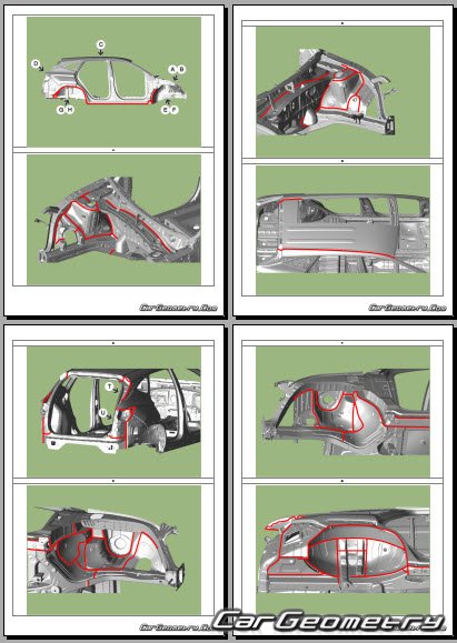 Информация по геометрическим размеры кузова Hyundai Tucson NX4e HEV, контрольным точкам, изображения сечений кузовных элементов, применяемым материалам, рекомендации по применимым типам, методам, материалам и местам сварки; места и материалы для нанесения шовных, звукоизолирующих, антикоррозионных мастик; места и направления резки кузовных элементов для последующей установки новых; типы материалов интерьера, обозначение и расшифровка.