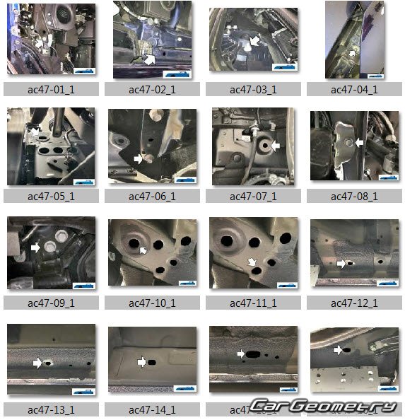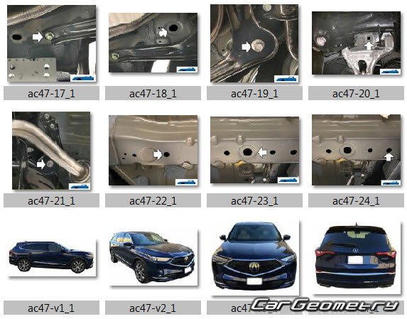 Информация по геометрическим размеры кузова Acura MDX 2021-2027, контрольным точкам, изображения сечений кузовных элементов, применяемым материалам, рекомендации по применимым типам, методам, материалам и местам сварки; места и материалы для нанесения шовных, звукоизолирующих, антикоррозионных мастик; места и направления резки кузовных элементов для последующей установки новых; типы материалов интерьера, обозначение и расшифровка.