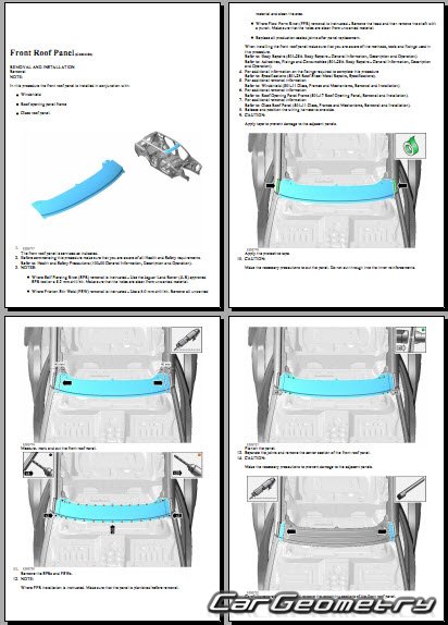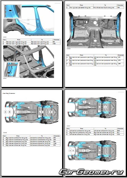 Информация по геометрическим размеры кузова Range Rover L460: контрольным точкам; изображения сечений кузовных элементов; применяемым материалам; рекомендации по применимым типам, методам, материалам и местам сварки; места и материалы для нанесения шовных, звукоизолирующих, антикоррозионных мастик; участки и направления резки элементов для последующей установки новых; типы материалов интерьера, обозначение и расшифровка.