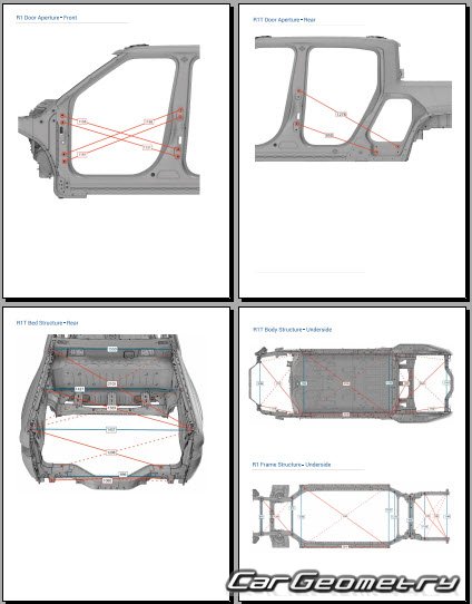 Выборка из заводской документации и различных стендовых баз по Rivian R1T 2022-2029 Body dimensions, стендовые размеры кузова и контрольные точки геометрии Ривиан Р1Т.