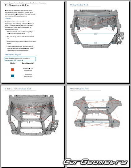 Кузовные размеры для восстановления геометрии кузова Rivian R1T 2022-2029. С помощью этих данных осуществляется проверка геометрии кузова пикап, с последующей рихтовкой поврежденных частей автомобилей Ривиан Р1Т.