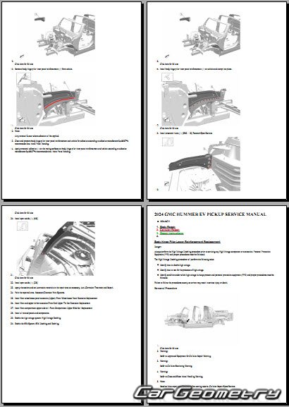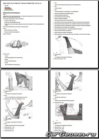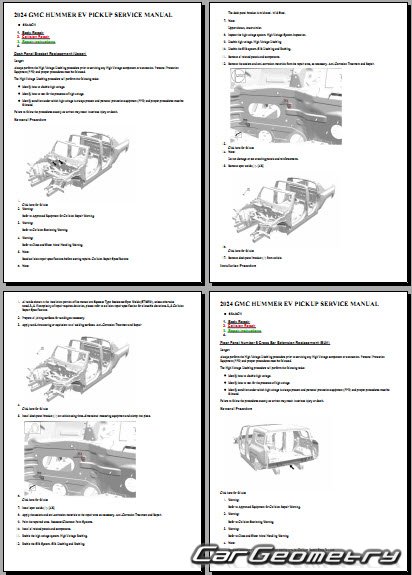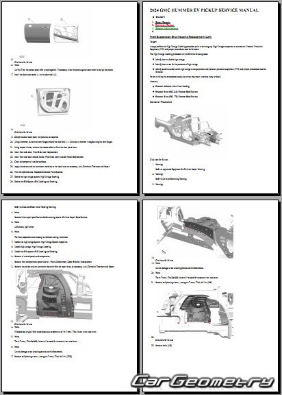 Руководство по кузовным работам GMC Hummer EV 2022-2027 Body Repair Manual на английском языке содержит 665 страниц исключительно полезной и необходимой информации для мастеров, которые проверяют геометрию кузова после ДТП и хотят выполнить восстановление кузова Джи Эм Си Хаммер EV согласно рекомендациям завода изготовителя.