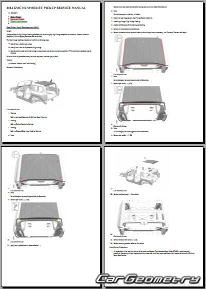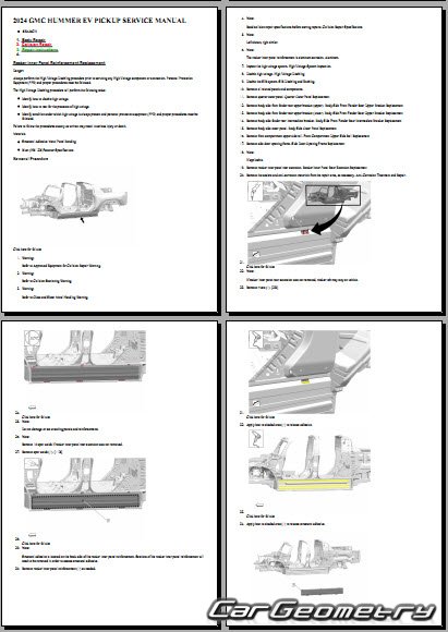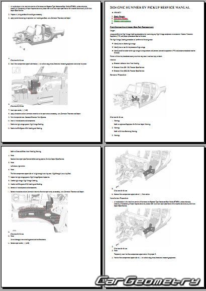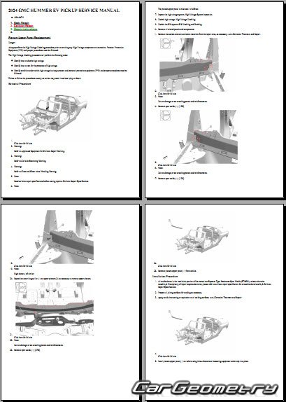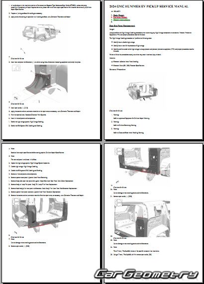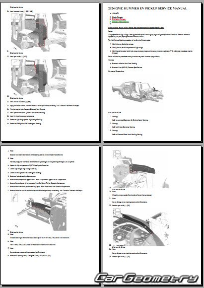 Заводское руководство содержит размеры кузова GMC Hummer EV 2022-2027 и включает описание замены элементов, кузовные размеры, контрольные точки геометрии кузовов Джи Эм Си Хаммер EV.