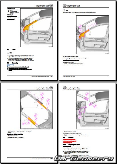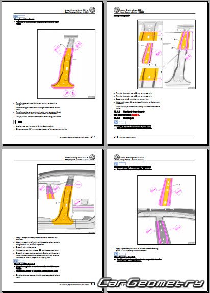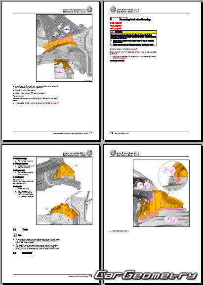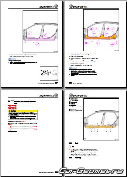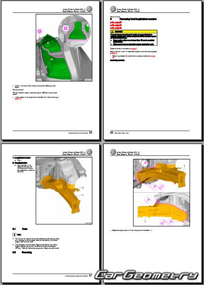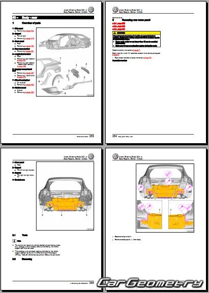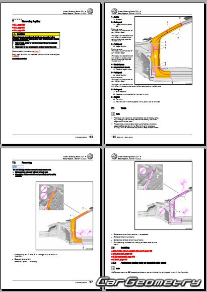 Заводское руководство содержит контрольные размеры кузова Volkswagen Arteon Wagon (3H) 2017-2025 Body Repair Manual и включает описание замены различных элементов кузова Wagon, контрольные точки геометрии кузова Фольксваген Артеон Шутинг Брейк.