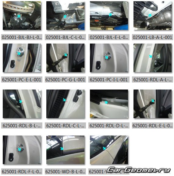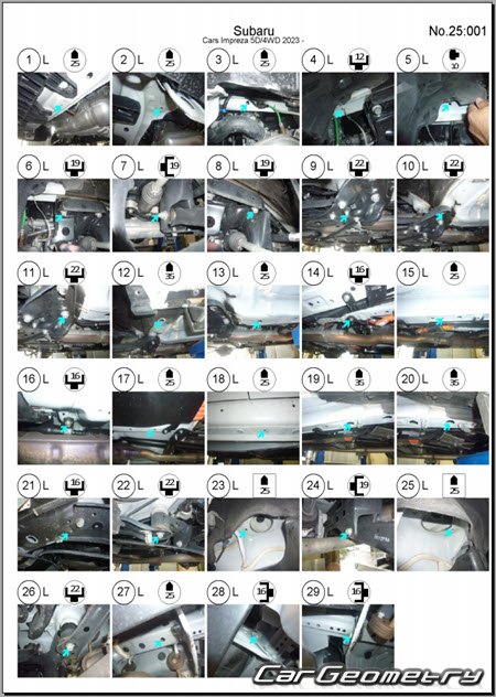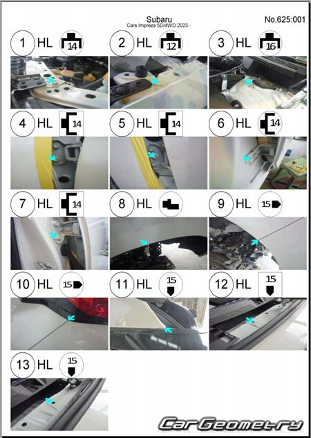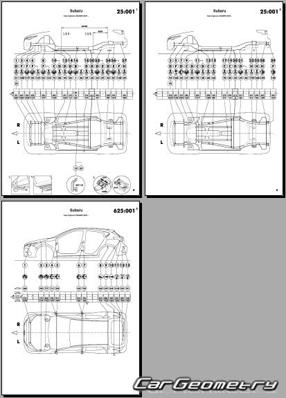 Кузовные размеры для восстановления геометрии кузова Subaru Impreza (GU) 2023-2028. С помощью этих данных осуществляется проверка геометрии кузова, с последующей рихтовкой поврежденных частей автомобилей Субару Импреза.