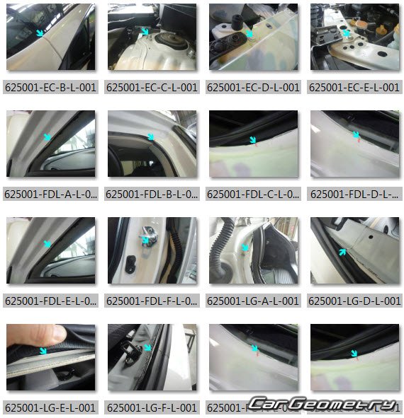 Информация по контрольным размеры кузова Subaru Impreza 2023-2028, контрольным точкам, изображения сечений кузовных элементов, применяемым материалам, рекомендации по применимым типам, методам, материалам и местам сварки; места и материалы для нанесения шовных, звукоизолирующих, антикоррозионных мастик; места и направления резки кузовных элементов для последующей установки новых; типы материалов интерьера, обозначение и расшифровка.