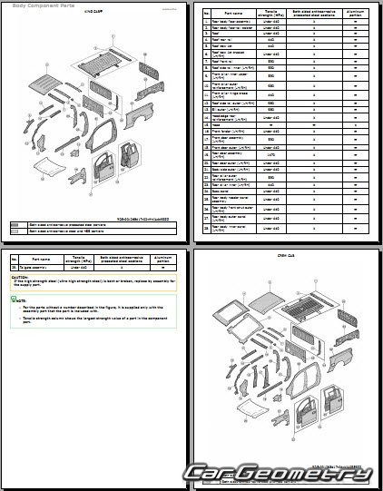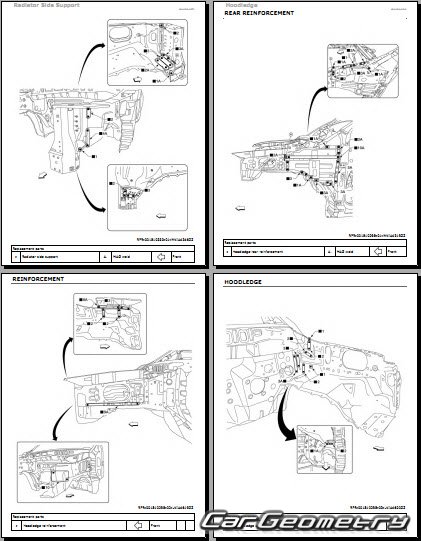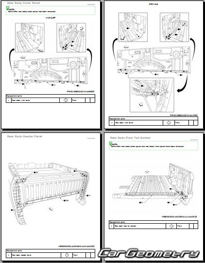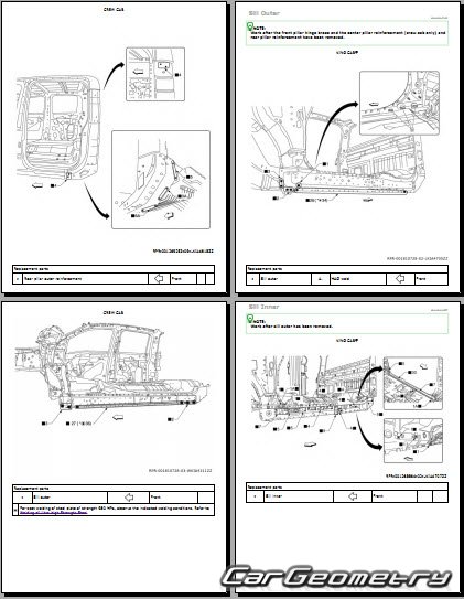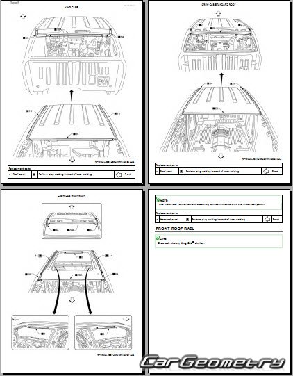 Информация по геометрическим размеры кузова Nissan Titan 2016-2024: контрольным точкам; изображения сечений кузовных элементов; применяемым материалам; рекомендации по применимым типам, методам, материалам и местам сварки; места и материалы для нанесения шовных, звукоизолирующих, антикоррозионных мастик; участки и направления резки элементов для последующей установки новых; типы материалов интерьера, обозначение и расшифровка.