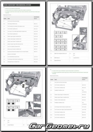 Информация по геометрическим размеры кузова Toyota Camry (AXVA80 MXVA80), контрольным точкам, изображения сечений кузовных элементов, применяемым материалам, рекомендации по применимым типам, методам, материалам и местам сварки; места и материалы для нанесения шовных, звукоизолирующих, антикоррозионных мастик; места и направления резки кузовных элементов для последующей установки новых; типы материалов интерьера, обозначение и расшифровка.