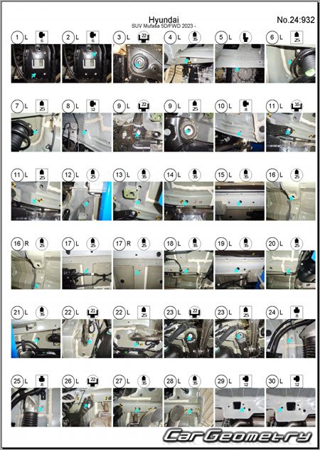 Заводское руководство включает размеры кузова Hyundai Mufasa (NU2) 2024-2028 и содержит кузовные размеры, контрольные точки геометрии кузова Хендай Муфаса для китайского рынка.