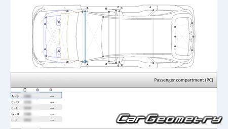 Кузовные размеры для восстановления геометрии кузова автомобилей Mazda CX-70 (KJ) 2024-2030. С помощью этих данных осуществляется проверка геометрии кузова, с последующей рихтовкой поврежденных частей автомобилей Мазда СХ-70.