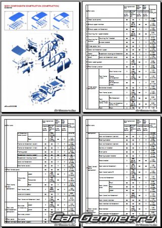 Информация по геометрическим размеры кузова Mazda CX-70: контрольным точкам; изображения сечений кузовных элементов; применяемым материалам; рекомендации по применимым типам, методам, материалам и местам сварки; места и материалы для нанесения шовных, звукоизолирующих, антикоррозионных мастик; участки и направления резки элементов для последующей установки новых; типы материалов интерьера, обозначение и расшифровка.