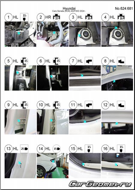 Информация по геометрическим размеры кузова Hyundai Sonata 2024-2026, контрольным точкам, изображения сечений кузовных элементов, применяемым материалам, рекомендации по применимым типам, методам, материалам и местам сварки; места и материалы для нанесения шовных, звукоизолирующих, антикоррозионных мастик; места и направления резки кузовных элементов для последующей установки новых; типы материалов интерьера, обозначение и расшифровка.
