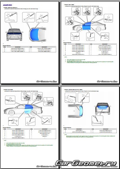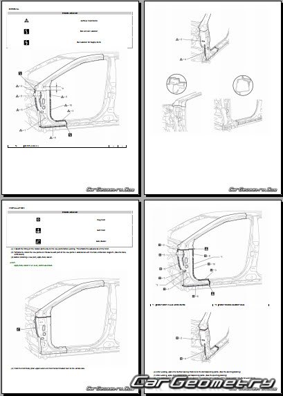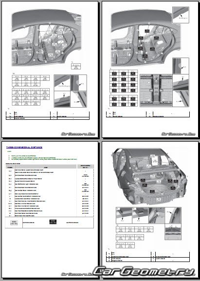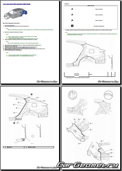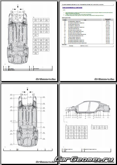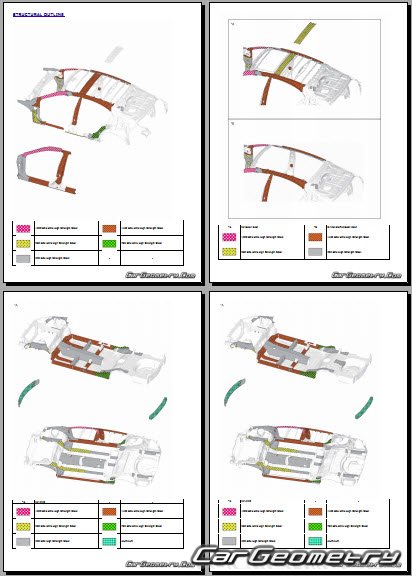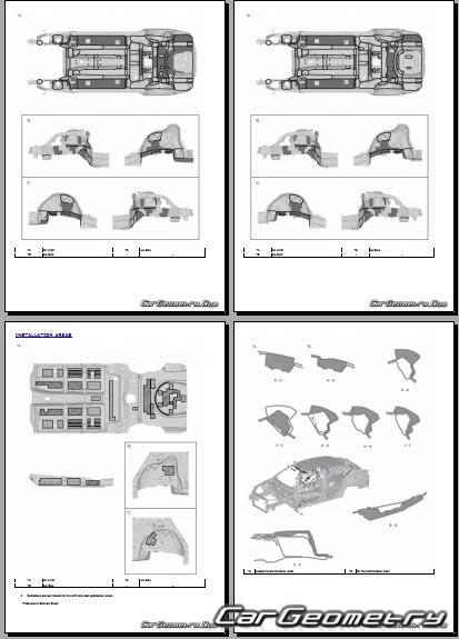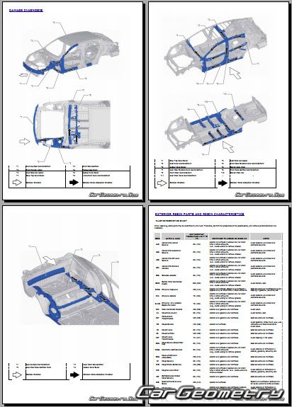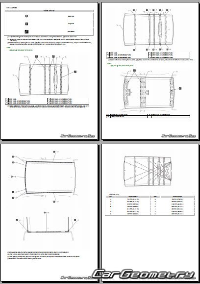 Информация по геометрическим размеры кузова Toyota Camry Hybrid, контрольным точкам, изображения сечений кузовных элементов, применяемым материалам, рекомендации по применимым типам, методам, материалам и местам сварки; места и материалы для нанесения шовных, звукоизолирующих, антикоррозионных мастик; места и направления резки кузовных элементов для последующей установки новых; типы материалов интерьера, обозначение и расшифровка.