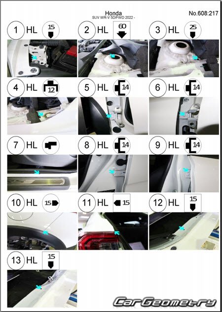 Кузовные размеры для восстановления геометрии кузова автомобилей Honda WR-V (DG5) 2023-2028. С помощью этих данных осуществляется проверка геометрии кузова, с последующей рихтовкой поврежденных частей автомобилей Хонда WR-V правый руль для японского рынка. Модель представляет собой адаптированный под требования японского рынка вариант Honda Elevate, ранее выпущенной в Индии.