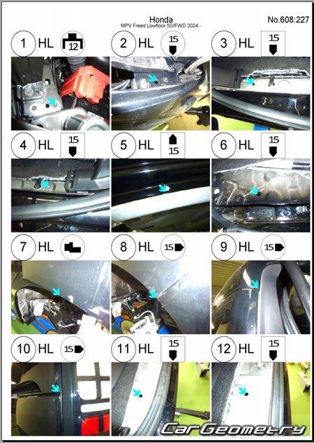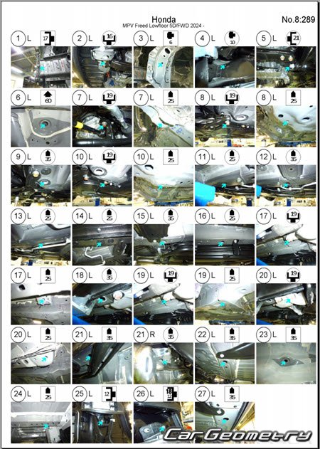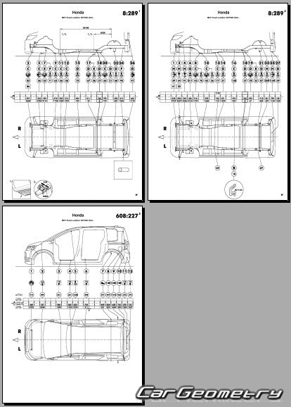 Кузовные размеры для восстановления геометрии кузова автомобилей Honda Freed (GT1 GT2 GT3 GT4) с 2024. С помощью этих данных осуществляется проверка геометрии кузова 2WD и 4WD, с последующей рихтовкой поврежденных частей автомобилей Хонда Фрид правый руль для японского рынка.