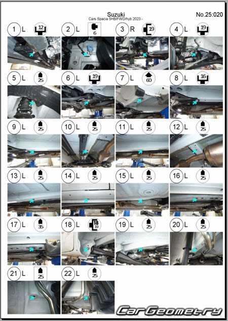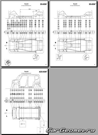 Кузовные размеры для восстановления геометрии кузова автомобилей Suzuki Spacia (MK54S MK94S) 2023–2028. С помощью этих данных осуществляется проверка геометрии кузова, с последующей рихтовкой поврежденных частей автомобилей Сузуки Спасиа (включая спортивную версию Спасиа Кастом) правый руль для рынка Японии.