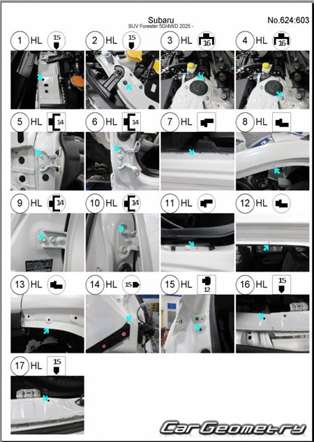 Кузовные размеры Subaru Forester (SL) 2025-2030 для восстановления геометрии кузова. С помощью этих данных осуществляется проверка геометрии кузова, с последующей рихтовкой поврежденных частей Субару Форестер шестого поколения.