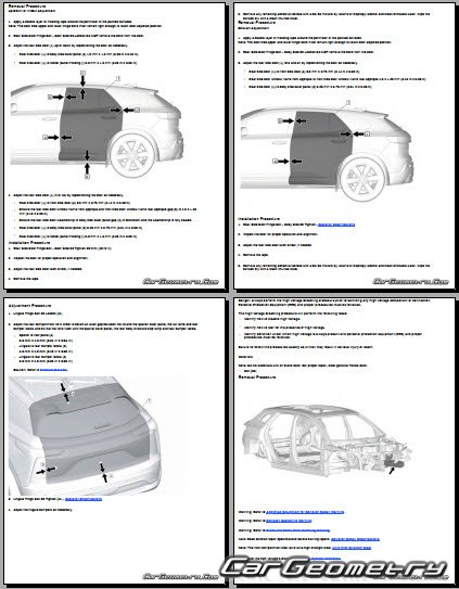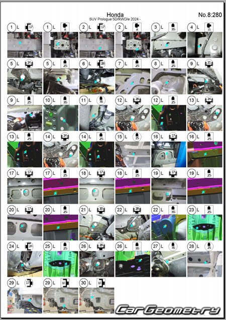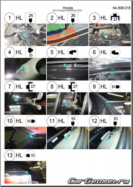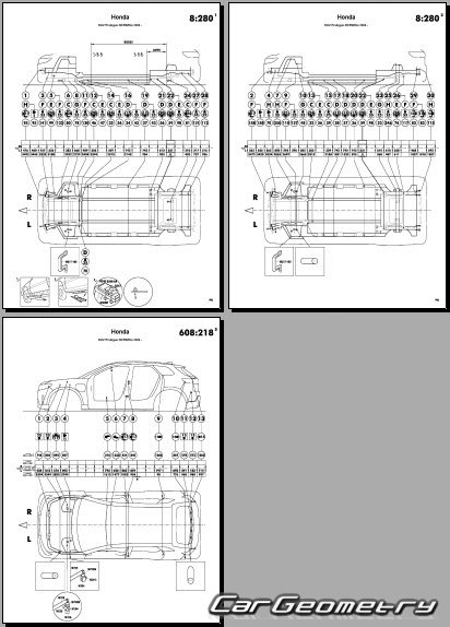 Заводское руководство содержит размеры кузова Honda Prologue 2024-2030 и включает описание замены элементов, кузовные размеры, контрольные точки геометрии кузова Хонда Пролог. Prologue — это электрический среднеразмерный кроссовер (mid-size SUV).