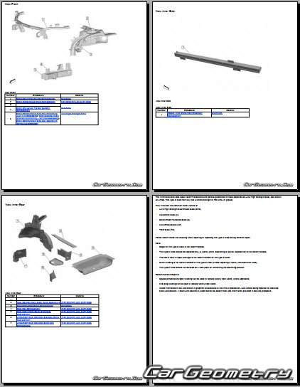 Информация по геометрическим размеры кузова Honda Prologue: контрольным точкам; изображения сечений кузовных элементов; применяемым материалам; рекомендации по применимым типам, методам, материалам и местам сварки; места и материалы для нанесения шовных, звукоизолирующих, антикоррозионных мастик; участки и направления резки элементов для последующей установки новых; типы материалов интерьера, обозначение и расшифровка.
