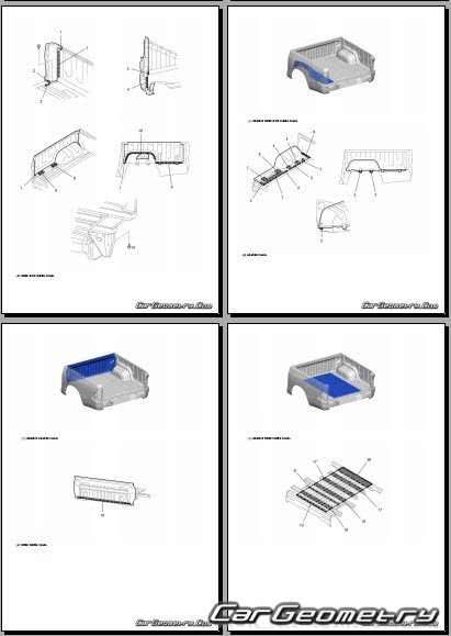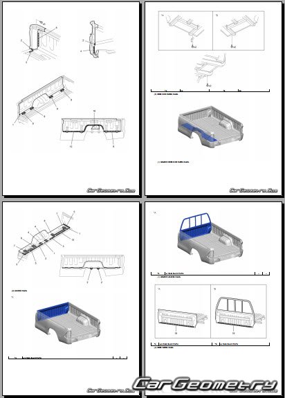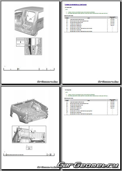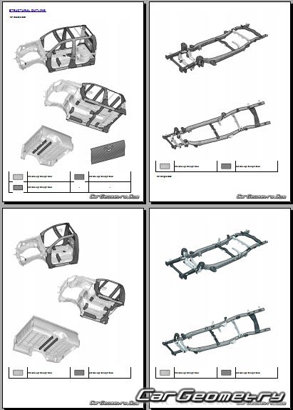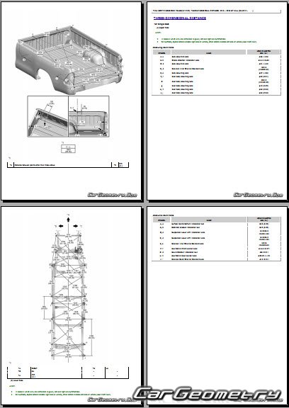 Информация по геометрическим размеры кузова Toyota Hilux, контрольным точкам, изображения сечений кузовных элементов, применяемым материалам, рекомендации по применимым типам, методам, материалам и местам сварки; места и материалы для нанесения шовных, звукоизолирующих, антикоррозионных мастик; места и направления резки кузовных элементов для последующей установки новых; типы материалов интерьера, обозначение и расшифровка.