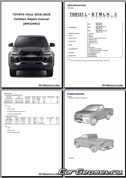 Руководство по кузовному ремонту Toyota Hilux (TGN121 TGN136 GUN126) 2020-2025 Collision shop manual 289 страницы на английском языке. Данный сборник содержит огромное количество исключительно полезной и необходимой информации для занимающихся кузовным ремонтом самостоятельно и владельцев фирм по кузовному ремонту автомобилей Тойота Хайликс.