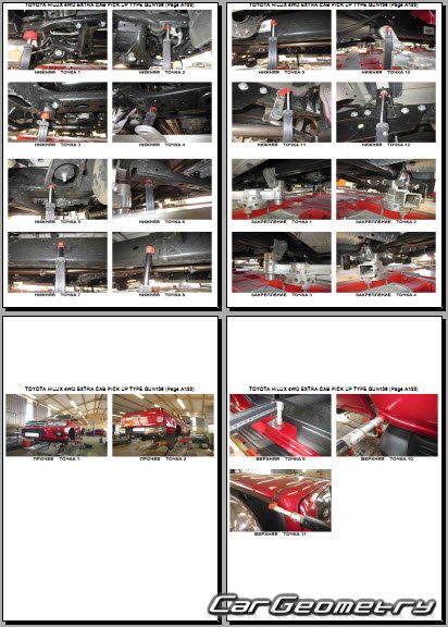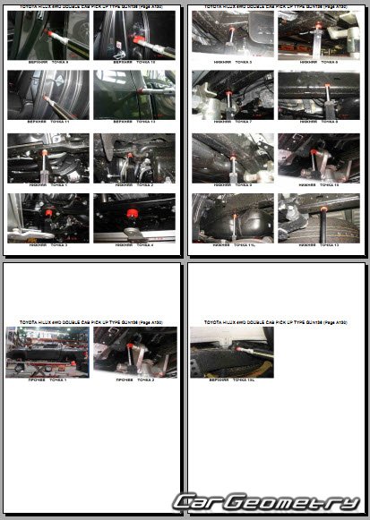 Кузовные размеры для восстановления геометрии кузова автомобилей Toyota Hilux (TGN121 TGN136 GUN126) 2020-2025. С помощью этих данных осуществляется проверка геометрии кузова, с последующей рихтовкой поврежденных частей автомобилей Тойота Хюликс восьмого поколения.