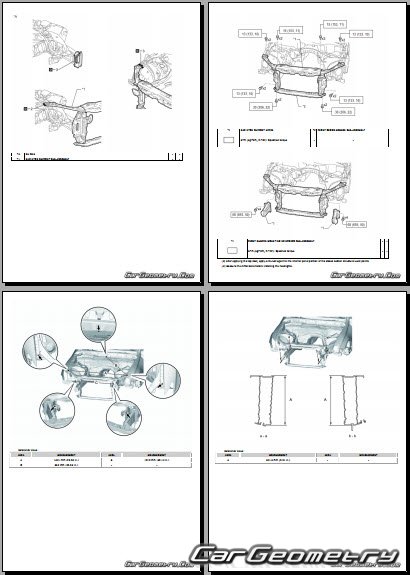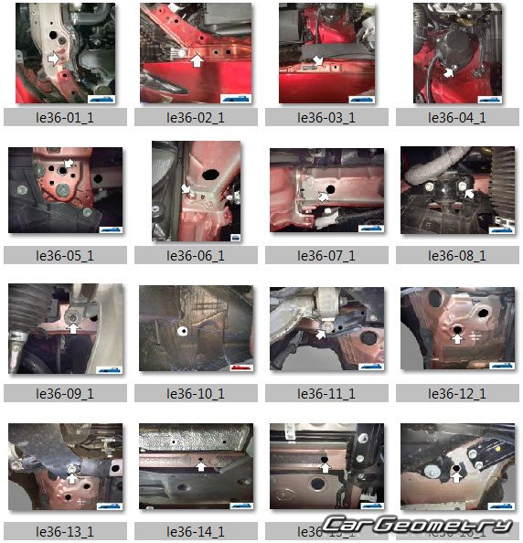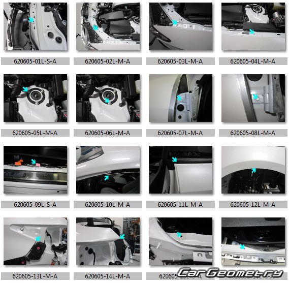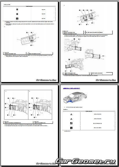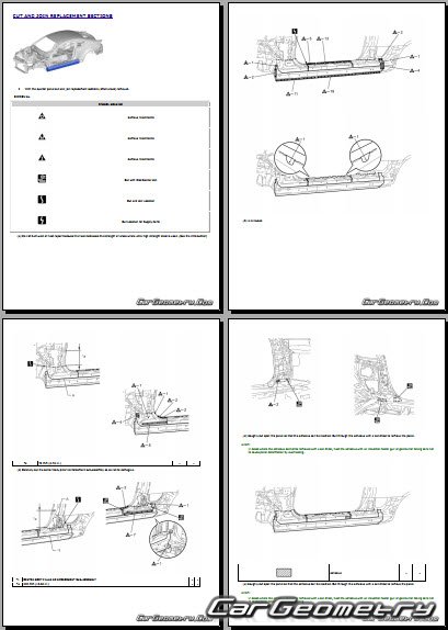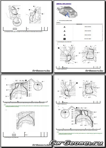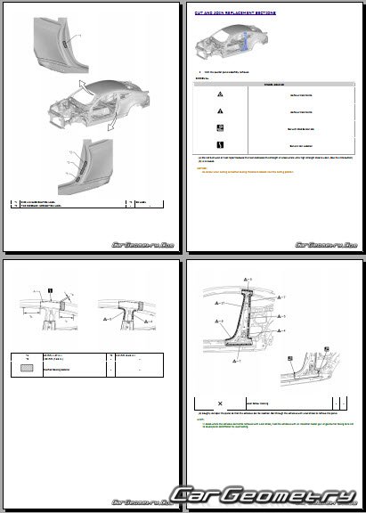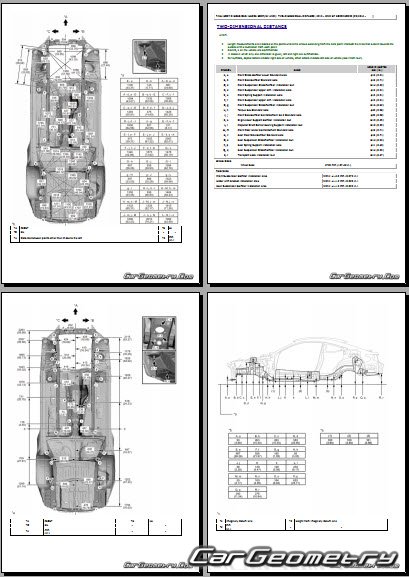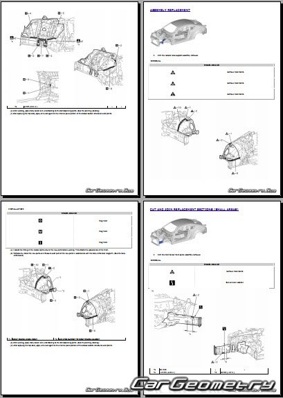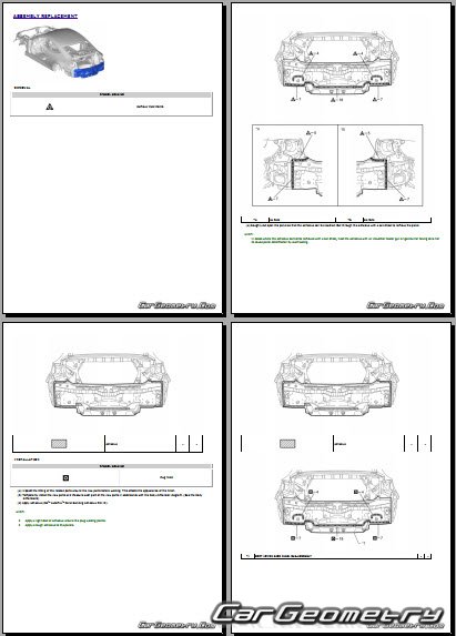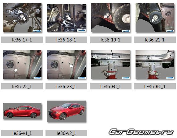 Информация по геометрическим размеры кузова Lexus RC200T, RC300, RC350 2021-2024 Collision Repair manual , контрольным точкам, изображения сечений кузовных элементов, применяемым материалам, рекомендации по применимым типам, методам, материалам и местам сварки; места и материалы для нанесения шовных, звукоизолирующих, антикоррозионных мастик; места и направления резки кузовных элементов для последующей установки новых; типы материалов интерьера, обозначение и расшифровка.