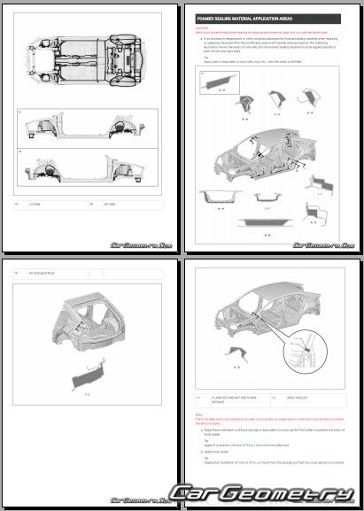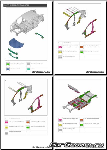 Информация по геометрическим размеры кузова Toyota C-HR+ (XEKM10 XEKM15), контрольным точкам, изображения сечений кузовных элементов, применяемым материалам, рекомендации по применимым типам, методам, материалам и местам сварки; места и материалы для нанесения шовных, звукоизолирующих, антикоррозионных мастик; места и направления резки кузовных элементов для последующей установки новых; типы материалов интерьера, обозначение и расшифровка.