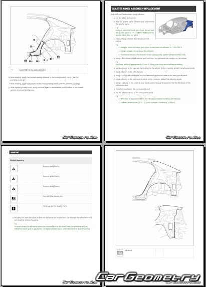 Руководство для фирменных СТО по ремонту повреждений кузова, полученных при столкновении для Toyota C-HR+ 2025-2030 (Collision Repair Manual) 269 страниц на английском языке. Данный сборник содержит огромное количество исключительно полезной и необходимой информации для занимающихся кузовным ремонтом самостоятельно и владельцев фирм по кузовному ремонту автомобилей Тойота C-HR плюс.