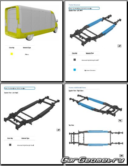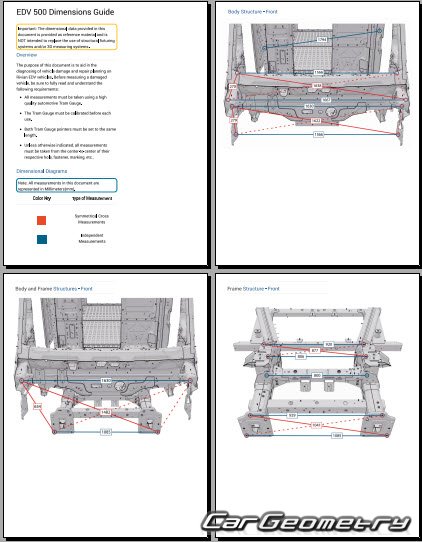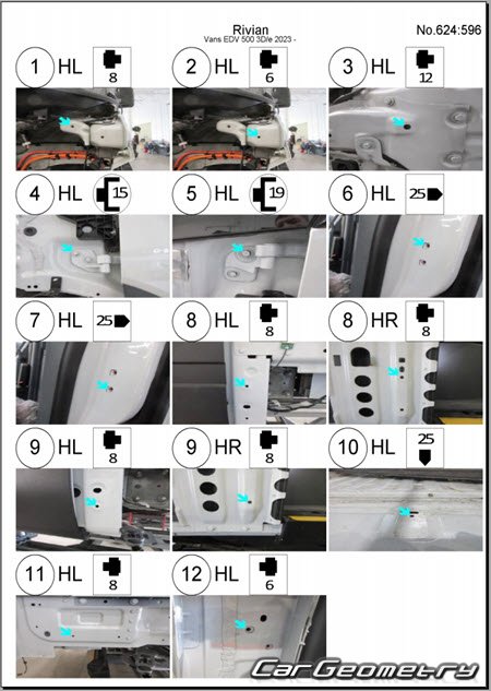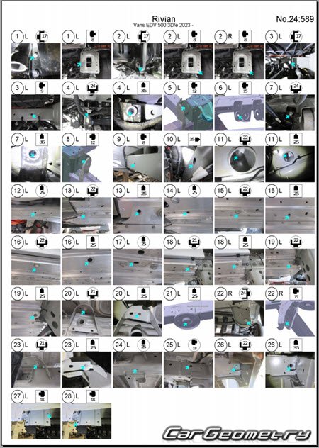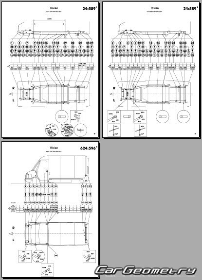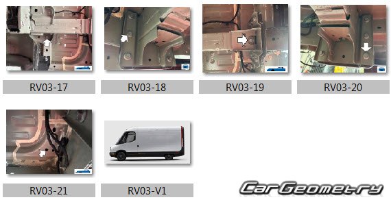 Кузовные размеры для восстановления геометрии кузова Rivian EDV 500 2023-2029. С помощью этих данных осуществляется проверка геометрии кузова VAN, с последующей рихтовкой поврежденных частей автомобилей Ривиан 500 Ван.
