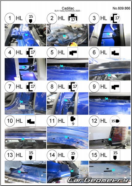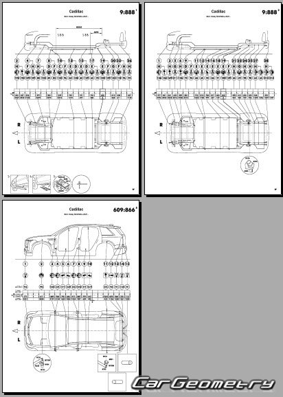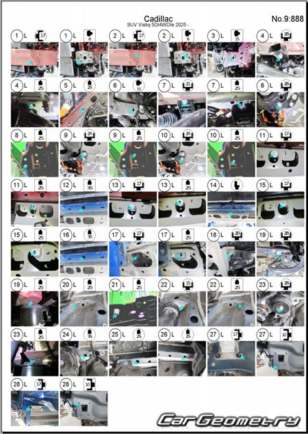 Кузовные размеры для восстановления геометрии кузова Cadillac Vistiq с 2025. С помощью этих данных осуществляется проверка геометрии кузова, с последующей рихтовкой поврежденных частей Кадиллак Вистик.