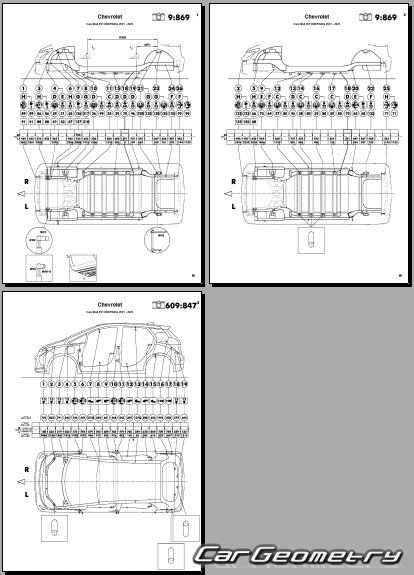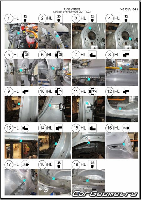 Кузовные размеры Chevrolet Bolt EV 2021–2023 для восстановления геометрии кузова. С помощью этих данных осуществляется проверка геометрии кузова, с последующей рихтовкой поврежденных частей автомобилей Шевроле Болт ЕВ.
