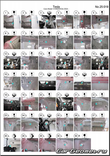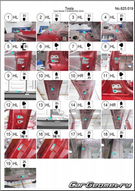 Кузовные размеры для восстановления геометрии кузова Tesla Model 3 2024-2029. С помощью этих данных осуществляется проверка геометрии кузова, с последующей рихтовкой поврежденных частей автомобилей Тесла Модель 3.