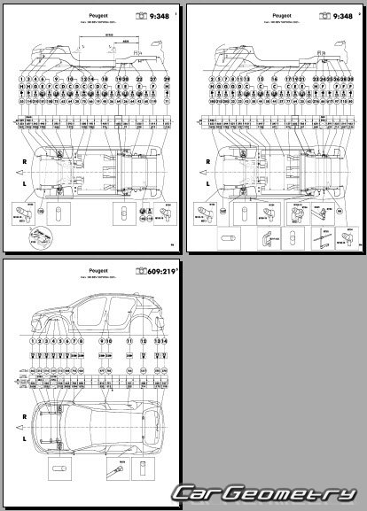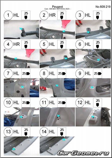 Кузовные размеры для восстановления геометрии кузова автомобилей Peugeot e-308 (EP51) 2022-2025. С помощью этих данных осуществляется проверка геометрии кузова, с последующей рихтовкой поврежденных частей автомобилей Пежо е308.