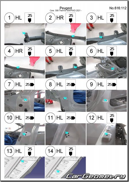Кузовные размеры для восстановления геометрии кузова автомобилей Peugeot 308 (P51 P52) с 2021 г.в.. С помощью этих данных осуществляется проверка геометрии кузова (5DR Hatchback, SW Wagon), с последующей рихтовкой поврежденных частей автомобилей Пежо 308.