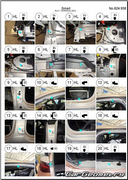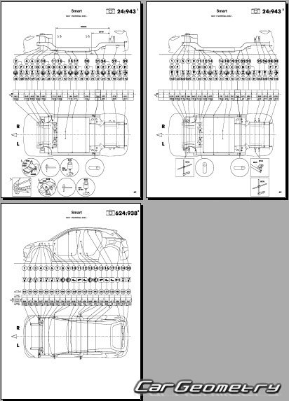 Кузовные размеры Smart #1 2022-2028 для проверки и восстановления геометрии кузова. С помощью этих данных осуществляется проверка геометрии кузова, с последующей рихтовкой поврежденных частей Смарт #1.