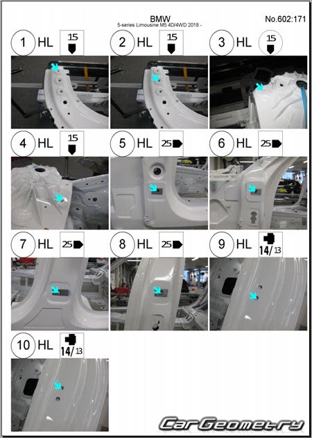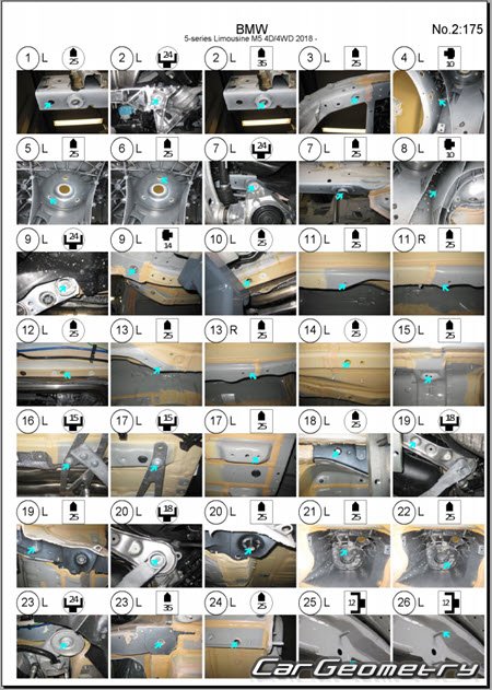 Кузовные размеры для восстановления геометрии кузова BMW M5 (F90) 2018-2024. С помощью этих данных осуществляется проверка геометрии кузова BMW M5, с последующей рихтовкой поврежденных частей БМВ М5 Ф90.