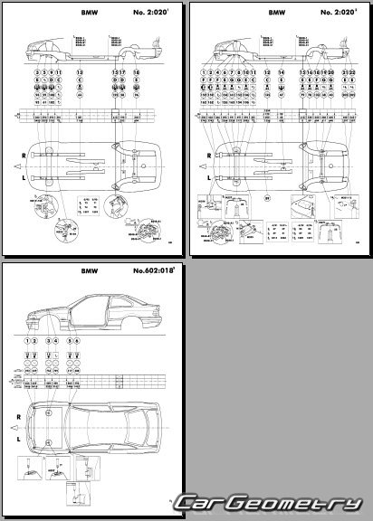 Кузовные размеры для восстановления геометрии кузова автомобилей BMW 3 Series (E36) 1994-2000 Coupe и Convartible. С помощью этих данных осуществляется проверка геометрии кузова, с последующей рихтовкой поврежденных частей автомобилей BMW 3 серии