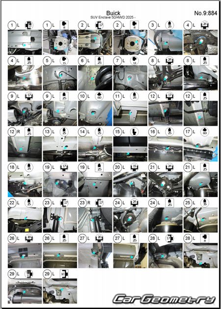 Кузовные размеры для восстановления геометрии кузова Buick Enclave 2024-2030. С помощью этих данных осуществляется проверка геометрии кузова, с последующей рихтовкой поврежденных частей автомобилей Бьюик Энклав.