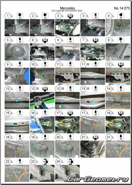Кузовные размеры Mercedes-Benz GLC-Class (X254) 2022–2028 для восстановления геометрии кузова. С помощью этих данных осуществляется проверка геометрии кузова икс254, с последующей рихтовкой поврежденных частей автомобилей Мерседес GLC класса.