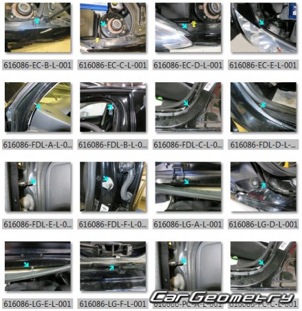 Выборка из стендовых баз по Peugeot 206+ 2009–2014 (3DR, 5DR Hatchback) Body dimensions, стендовые размеры кузова и контрольные точки геометрии Пежо 206+.