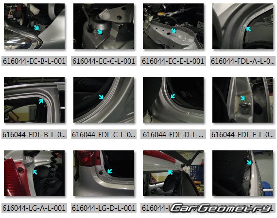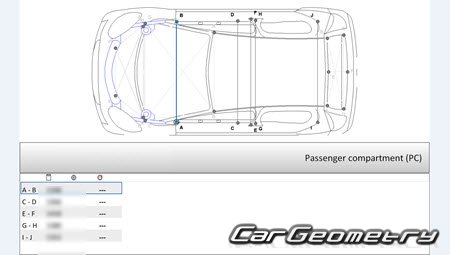Выборка из стендовых баз по Peugeot 107 2005–2013 (3DR, 5DR Hatchback) Body dimensions, стендовые размеры кузова и контрольные точки геометрии Пежо 107.