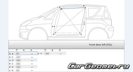 Кузовные размеры для восстановления геометрии кузова автомобилей Peugeot 1007 2005–2010. С помощью этих данных осуществляется проверка геометрии кузова, с последующей рихтовкой поврежденных частей автомобилей Пежо 1007.