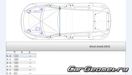 Кузовные размеры для восстановления геометрии кузова автомобилей Citroen DS5 2011-2018. С помощью этих данных осуществляется проверка геометрии кузова, с последующей рихтовкой поврежденных частей автомобилей Ситроен ДС5 (включая гибридную версия).
