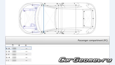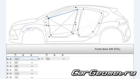 Кузовные размеры для восстановления геометрии кузова автомобилей Citroen DS4 2011-2020. С помощью этих данных осуществляется проверка геометрии кузова, с последующей рихтовкой поврежденных частей автомобилей Ситроен ДС4.