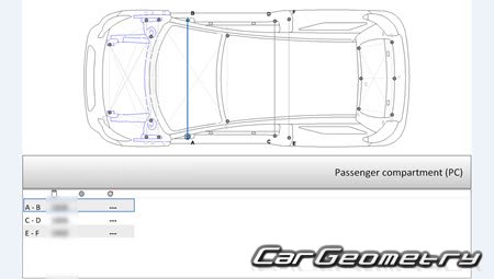 Кузовные размеры для восстановления геометрии кузова автомобилей Citroen DS3 2010-2017. С помощью этих данных осуществляется проверка геометрии кузова, с последующей рихтовкой поврежденных частей автомобилей Ситроен ДС3.