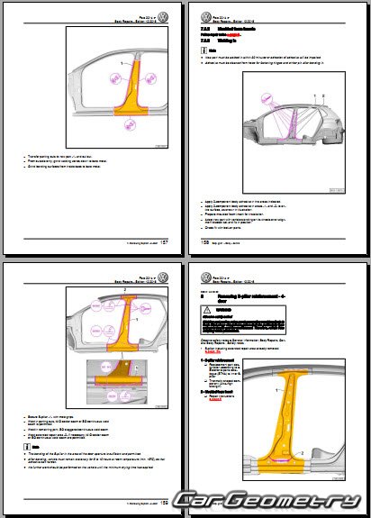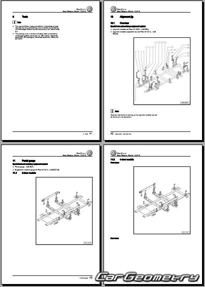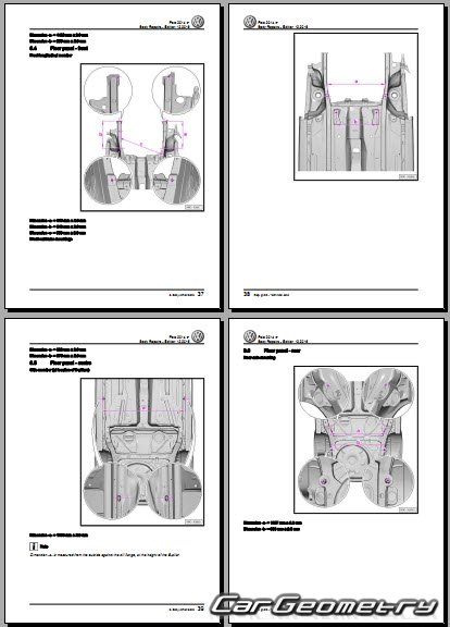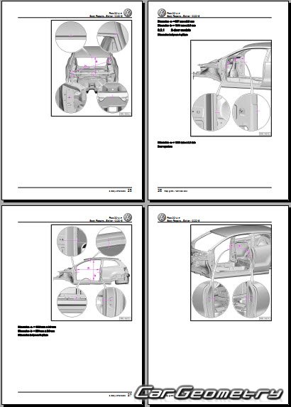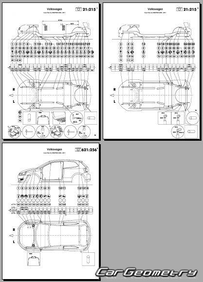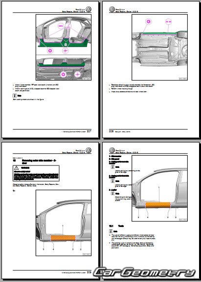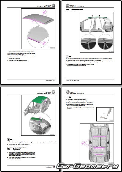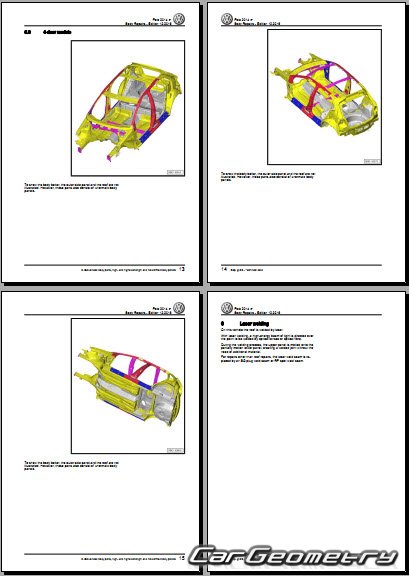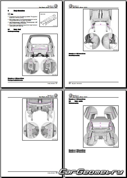 Заводское руководство содержит контрольные размеры кузова Volkswagen Polo (Typ 6R) 2009–2018 Body Repair Manual и включает описание замены различных элементов кузова (3DR 5DR Hatchback), контрольные точки геометрии кузова Фольксваген Гольф.